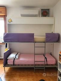 Letto a castello a scomparsa con scrivania apribile di larghezza 80 cm e lunga come la lunghezza dei letti, contenitore in alto apribile, marca CLEI, alto 220 cm, letti singoli di dimensione starndard completo di scaletta e di materassi usati ma come nuovi. Pronto il ritiro smontato con il libretto di istruzioni per il montaggio, anno di acquisto 2014