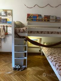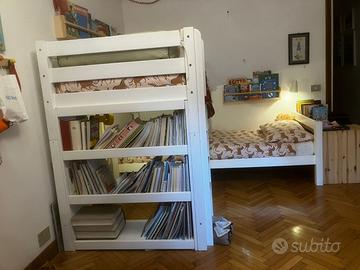 Vendesi letto a castello BEFARA a L con libreria incorporata, in legno massello di faggio bianco.