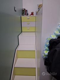 Vendo pari al nuovo, letto a castello (tre posti letto), scalette con cassettoni interni,comodini e materassi.
