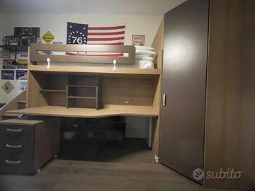 Un letto a castello moderno e funzionale composto da scala con gradini contenitori, letto con protezione e rotelle, scrivania e cassettiera su ruote. Armadio capiente con luci a sensore di movimento e specchio. Tutto in ottime condizioni. Materasso e due cuscini compresi nel prezzo.
