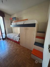 Sotto il letto inferiore sono presenti 2 ampi cassettoni grandi quanto tutta la lunghezza del letto. La struttura comprende inoltre un armadio capiente a due ante, mobile pensile chiuso con 3 ripiani, perfetto come libreria e scala laterale con 5 gradini contenitore, profondi fino a terra.