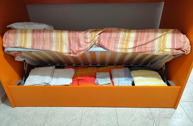 Letto a castello completo come in foto. Praticamente nuovo, usato solo per pochi mesi. Completo di reti e materassi con comodissimo cassettone porta coperte o oggetti vari. Vendo per trasferimento in altra abitazione già arredata. Vero affare!