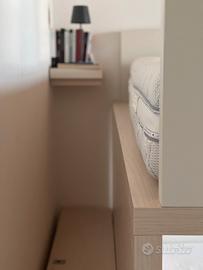 Letto a castello con cassettoni a gradini e ruote. Legno bianco e naturale. Viene venduto con un materasso.