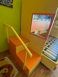 Letto a castello con ponte mobile per salire sul letto superiore. La struttura è molto solida e si muove su ruote.