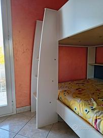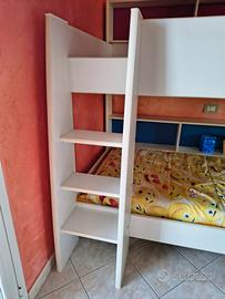 Letto a castello con libreria e scalini mai utilizzato, colori bianco, azzurro e borgogna, molto particolare. Misura lunghezza cm.210, larghezza compresi scalini cm.135, altezza cm.165. Dietro la busta blu c'è un taglio in per consentire l'utilizzo della presa di corrente grande quanto la placchetta in foto sopra (che in ogni caso si nasconde facilmente come foto). Se interessati regalo materassini nuovi.