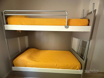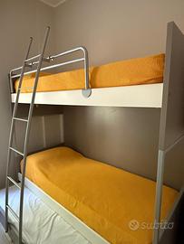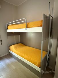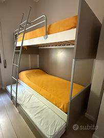 Letto a castello in ottime condizioni, struttura solida e moderna nei colori bianco, grigio e acciaio. Completo di scaletta laterale, sponde di sicurezza superiori e pannelli grigi di rifinitura. Letto sottostante estraibile, compreso di 3 materassi. Ideale per cameretta o casa vacanze, salvaspazio e funzionale. Misure: 200 x 90 cm.