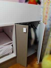 Letto a castello in legno con scala, armadio e 2 cassetti. Comprato a febbraio 2025. Colore bianco /taupe