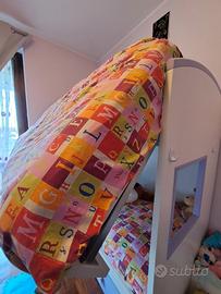 letto a castello con doghe. Meccanismo a ribalta per rifare comodamente il letto. 2 pratici cassettoni. si può trasportare in auto. bellissimo colore lilla e bianco, disponibili 2 sbarre protettive.