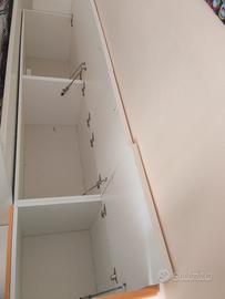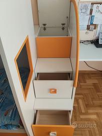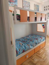 Letto a castello con cassettoni 90x200 Letto inferiore con rete a doghe in legno Scala laterale con 2 cassetti e scomparto 50x120 Cassone posteriore a 2 scomparti 200x50 Ha qualche segno di usura ma è comunque ben tenuto Possibilità di avere 2 materassi. Non spendibile ma da ritirare in modo indipendente. Al momento del ritiro la struttura sarà fatta trovare gia smontata.