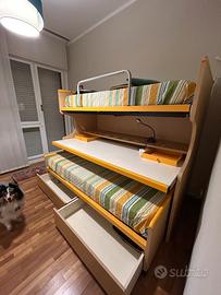 Struttura composta da letto da due letti di cui uno estraibile con ruote. Scrivania integrata ed estraibile e due ampi cassettoni sotto il letto estraibile