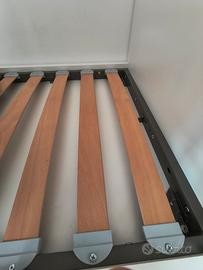 Letto a castello, doghe in legno, due cassettoni. È possibile spostare il letto sottostante ed anche rimuovere i cassettoni. Sponda reclinabile.