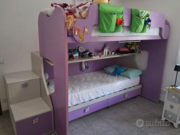 Letto a castello con letto superiore scorrevole in perfette condizioni,acquistato da mobili federici,smontaggio a carico dall'acquirente e ritiro in loco . Materassi esclusi. Dimensioni: lunghezza struttura viola 210 cm, altezza 173 cm, profondità da chiuso 88 cm,profondità da aperto 128 cm, profondità gradoni 85 cm, lunghezza gradoni 45 cm .