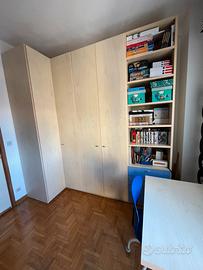 Camera completa di letto a castello con scale per raggiungerlo, un comodino, una scrivania e armadio ad angolo.