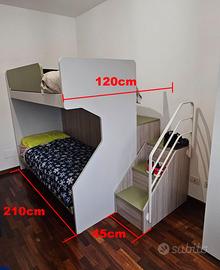 Cameretta letto a castello, con scale e piattaforma con contenitori, comperato da ILMA mobili (PR) 5 anni fa. I due letti, compresi di reti, sono per materassi 80x190. La scala è amovibile.