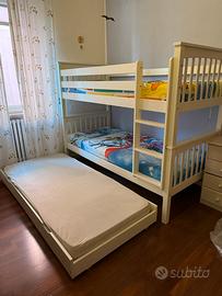 Letto a castello in legno laccato bianco opaco in buone condizioni. Die letti con un terzo lettino estraibile. Materassi come nuovi in ottime condizioni. Struttura smontata in box e disponibile per vendita. No spedizione.