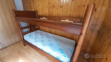 Letto a castello in noce massiccio, completo di scaletta, usato poco, con reti e materassi a molle Doimo, buone condizioni. Bandine laterali artigianali. Misure materassi 190x80. Ingombro del letto cm. 203x90 circa.