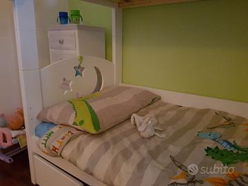 Letto a castello come in foto in legno bianco molto solido e ben tenuto, completo di materassi, che sono abbastanza sottili ma mai sporcati perchè sempre tenuti con il lenzuolo cerato. Come si vede dalle foto, eventualmente i letti possono essere anche tenuti affiancati e non a castello. Il letto inferiore è dotato di cassettone per riporre lenzuoli. I lettini hanno le doghe in legno. Visionabile a Ravenna, no spedizione. A breve verrà smontato. Misure 187x88x70h a lettino.