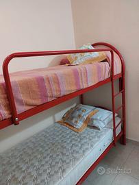 vendo letto a castello in metallo, in ottime condizioni, usato pochissimo. struttura solida e stabile, di colore rosso vivace. Dotato di scaletta integrata a reti a doghe in legno. Materassi inclusi