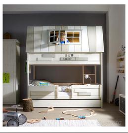 letto a castello HANGOUT è come una casetta sull'albero. Composto da una struttura con due letti di misure variabili – 90x200 entrambi i letti – 90x200 + 120x200 – 90x200+140x200. I letti sono dotati di doghe base, in modo da poter dormire sempre in 2. Il letto superiore è raggiungibile con scaletta interna se in versione gioco o scaletta esterna se in versione letto a castello. Il tetto è completo di finestrella apribile e dall'altra parte la struttura in legno è coperta da un rivestimento in tessuto antracite così da poterlo alzare per rifare meglio il letto o nel caso in cui si volesse arieggiare meglio il bimbo quando dorme nelle calde serate estive. Pensato per fratelli e sorelle di età vicina ma anche per un solo bambino, la struttura del letto a cassetta è in legno massello composta da due letti: una volta che i bambini crescono, la casetta si smonta e rimane solo la struttura per due letti singoli. Reti a doghe in legno incluse. Si può aggiungere un cassettone sotto al letto. Dalla concezione nord europea: alta qualità in legno massello di pino e kit di montaggio con istruzioni. Dimensioni letto a castello: L.207 x P.102 x H.227 cm (compreso il tetto).