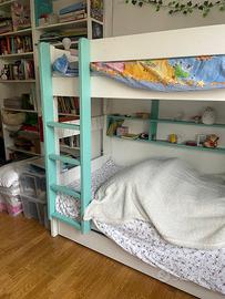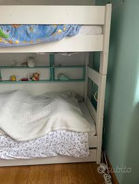 Vendo splendido letto a castello della prestigiosa casa belga Mathy by Bols, modello Dominique 166. Marchio belga di mobili di altissima qualità, realizzati in legno massello con finiture artigianali. Il letto è in ottime condizioni ed è così configurato: • Colore: Struttura bianca con inserti (scala e mensole) color Turchese/Acqua. • Misure: Adatto per materassi standard 90x190 cm. • Accessori inclusi: 1. Pratica mensola portaoggetti integrata (perfetta per libri o luce notturna). 2. Ampio cassetto sottostante (ideale come contenitore o per un terzo materasso ospite). Due materassi a molle inclusi. Il letto viene venduto montato, anche oer consentirne la visione. Diaponibile per ritiro dal 6 maggio p.v.
