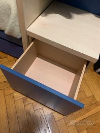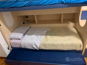 Letto a castello, con corridoio e scalini con cassetti e comodini. Lungo 248cm largo 136cm e alto 176cm