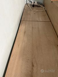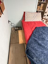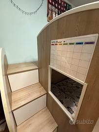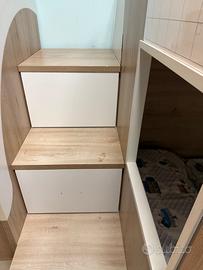 Accanto al letto superiore c’è la passatoia dov’è troviamo 3 ampi vani contenitori. Ci sono 2 casetti anche sulle scale e sotto al letto inferiore. La sponda è scorrevole.
