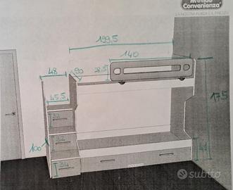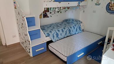 Letto a castello mondo convenienza con 3 letti, scalini con sportelli, sbarra e un materasso incluso. Laterale del letto estraibile rotto all'interno, ma aggiustato come da foto. Piccoli segni di usura, ma in ottimo stato. Verrà consegnato da smontare e senza adesivi. Ritiro a Roma primo piano.
