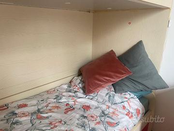 In legno massello + scaletta + 2 reti + 2 cassettoni + sponda di protezione.