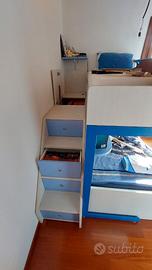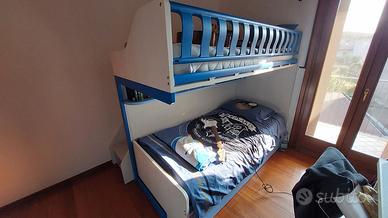 Letto a castello Moretti. Sulle scale 4 cassetti e nel camminamento è presente un'ampia botola. Nella struttura sottostante ci sono delle mensoline, 2 ampi cassettoni e il letto si può tirare fuori per posizionare del materiale. Dimensioni d'ingombro: lunghezza 240 cm larghezza 155 cm altezza 180 cm.