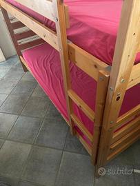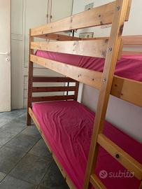 Due lettini che possono essere a castello o separati e diventare singoli, di legno Dimensioni 200cm lunghezza 90 larghezza 144 altezza del castello 72 altezza del singolo lettino