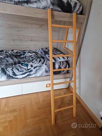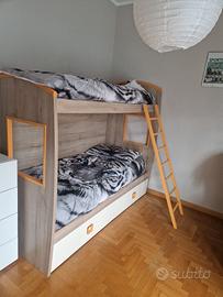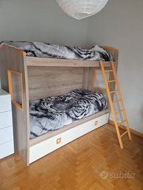 Vendo letto a castello per cameretta, 2 letti ad una piazza comprensivi di materasso, scaletta. Mai usato per dormire quindi materassi nuovi. Mondo convenienza. Colori legno chiaro e arancione.