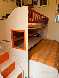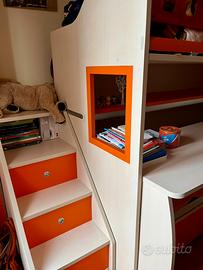 Moretti Compact, camere per ragazzi di alta qualità. Vendi letto a castello con due letti (1 letto alto + 1 letto sotto che ha ruote e si nasconde sotto la scrivania) con scrivania con ruote a scomparsa e scaletta comoda per salire con gradini grandi e caratterizzati da vani per riporre oggetti. Blocco originale di Moretti Compact, color beige e arancione. Letti lunghi 2 metri e larghi 90