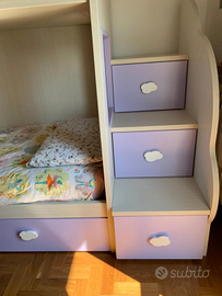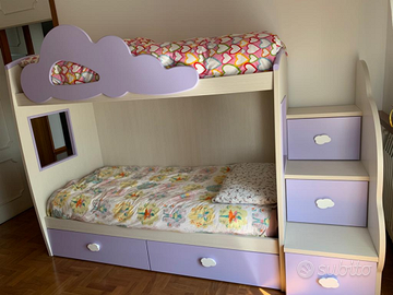 Letto a castello composto da due cassettoni inferiori , protezione a forma di nuvola, scala con 3 gradini contenitori.