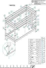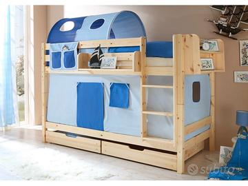 - Letto a castello TICAA MARCEL in legno di pino massiccio (misure P99 X H140 X L208 cm, spessore 54 X 54 mm) - 2 mensole (40x22x17 mm e 80x22x17 mm) in pino massiccio - Tende in tessuto (100% cotone) color celeste e azzurro - Doghe Senza cassetti e senza materassi e senza tunnel (riportato in foto del sito TICAA) Manuale di istruzione per montaggio. visibile zona Valmontone (preferibilnmente) oppure Roma EUR