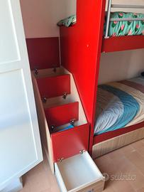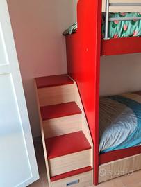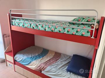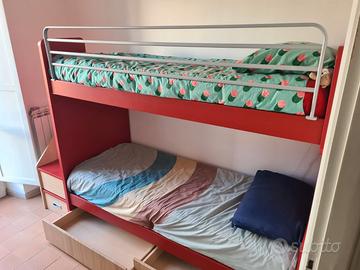 Letto a castello in ottimo stato, robusto con cassettoni sotto letto inferiore e contenitori nella scala. Inclusi i due materassi 200 x 90 molto buoni, usati pochissimo. Visibile a Marina di Cerveteri
