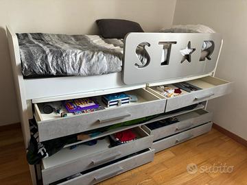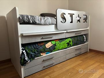 • Capacità contenitiva: Dotato di ben 6 ampi cassettoni (4 alla base e 2 sotto il letto superiore) per riporre vestiti, giochi e libri.