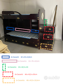 1x Letto a Castello Salvaspazio con Scala a Cassettoni e Camminatoio con Botola. Completo di Scrittoio a scomparsa.