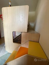 Scaletta esterna con scomparti porta oggetti nascosti, dispone anche di altri 2 cassettoni capienti con ruote sotto il letto a pavimento.