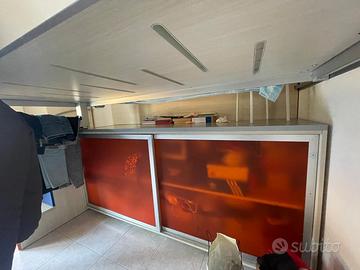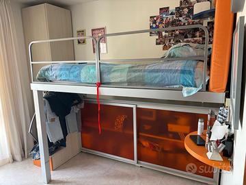 Vendesi struttura di letto a castello, le sue scalette dotate di cassetti (3: 1 per livello) e corrimano, mobile di camminamento (a sx del letto nella foto) con spazio contenitore (quello dalle ante rosse in foto). Ingombro della struttura: Lunghezza dal muro fino alla fine del letto 220cm + lunghezza scalette 51cm: totale lunghezza 271cm (con corrimano 273cm). Larghezza dal muro fino al piano del letto 50cm + solo letto 100cm: totale larghezza 150cm. Altezza dalle sbarre metalliche di protezione del letto fino a terra: 190cm; escludendo sbarre, materasso e testiera, dal piano del letto fino a terra: altezza 140cm. Altezza totale scalette: 74cm, escludendo ultimo gradino per camminamento. Altezza del mobile rosso (camminamento): 105cm. Lunghezza del mobile di camminamento: 230cm. Altezza di ogni gradino delle scalette: 25cm. Larghezza dei cassetti aperti delle scalette: 38cm. STRUTTURA DA SMONTARE: appartamento accessibile con ascensore. MATERASSO, LETTO e CUSCINI ovviamente ESCLUSI. Per appuntamento ci accordiamo telefonicamente. Buone condizioni. Per maggiori info, contattateci.