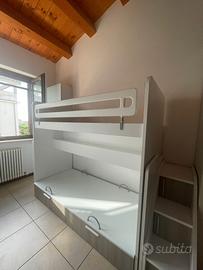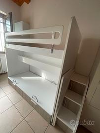 Vendesi letto a castello con parte inferiore scorrevole e dotata di cassetti incorporati. Scaletta laterale con scalini-scarpiera. Ideale per ragazzi fino a 13 anni Buone condizioni Ritiro a carico dell' acquirente.