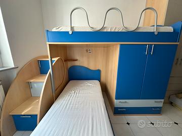 Vendo cameretta a castello in legno e laminato color blu e rovere chiaro, ideale per ottimizzare lo spazio in una stanza.