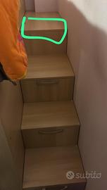 Vendo letto a castello con scalini a cassetto, scrivania, cassettiera e mensola compreso di materassi e sedia (il sedile è un pochino usurato). Tutti i dettagli e le misure nelle foto. Disponibile da metà marzo.