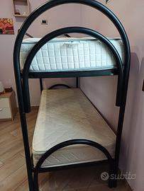 letto a castello in metallo molto robusto colore nero, completo di sponda piano superiore, scaletta originale in metallo più scaletta artigianale in legno. Non comprensivo di materassi. trasporto a carico dell'acquirente. presente qualche piccolo graffio.Misure...lunghezza 200 cm, larghezza 81 cm, altezza massima 158 cm, altezza letto superiore 113 cm.