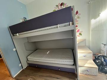 Prezzo trattabile. Letto SLOT con scaletta con cassetti, colore nuvola, frontali cassetti color bucaneve, finiture scaletta e pedana colore woody. Letto inferiore attrezzato con cassetti e ruote. Due materassi 80x190 (il superiore può essere sostituito con materasso 80x200).