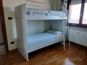 Letto a castello SMART (San Martino mobili) completo come da foto con due materassi ortopedici Eminflex. Dimensioni: 199 x 87cm, altezza totale 165cm. Struttura in legno, reti a doghe, spondina e scaletta in metallo. Usato un paio di volte, in pratica come nuovo. Attualmente già smontato e pronto da trasportare, da ritirare a Portogruaro, non viene spedito