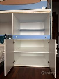 Letti a castello, complessivo di ottima struttura in legno resistente, ampio mobile porta oggetti (es: giocattoli), grande scrivania estraibile, reti in doghe per i 2 letti (non sono inclusi i materassi), scaletta laterale contenuta nella struttura.