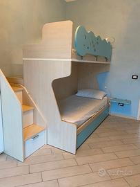 Letto a castello con scale contenitori e soppalco contenitori , terzo letto estraibile con piedini e due mensole celesti per sostituire comodino ( per sopra e sotto) della Colombini