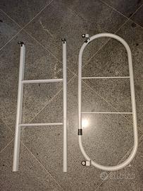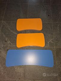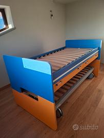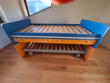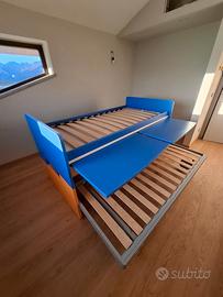 vendo letto a castello blu e arancio causa inutilizzo composto da: 2 letti con reti di cui una su ruote grandi, scrivania doppia a scomparsa, 2 cassetti. inoltre, il letto e' completato da 4 mensole (3 arancioni e una blu), la scaletta per salire e una ringhiera di protezione per bambini. prezzo trattabile. il letto e' ora smontato per facilitare il trasporto in quanto molto pesante (le strutture e i pannelli non sono in compensato, ma materiale trattato molto robusto). la struttura ha rotelle per la movimentazione sia sulla struttura blu e arancio, sia sul letto inferiore