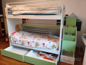 Vendo letto a castello scorrevole per bambini. Larghezza struttura letto 205 cm Larghezza scala contenitore 45cm Profondità da aperto 133 cm Profondità da chiuso 93 cm Altezza 180 cm Normali condizioni con leggeri segni di usura Materassi non inclusi