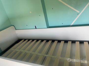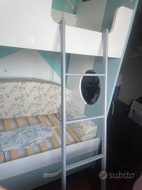 Vendo letto a castello mondo convenienza, il letto e’ stato montato ma mai usato quindi in ottime condizioni, color bianco e acqua marina, scaletta e 2 cassetti, se interessati do in dotazione i cuscini e copri materasso abbinati.